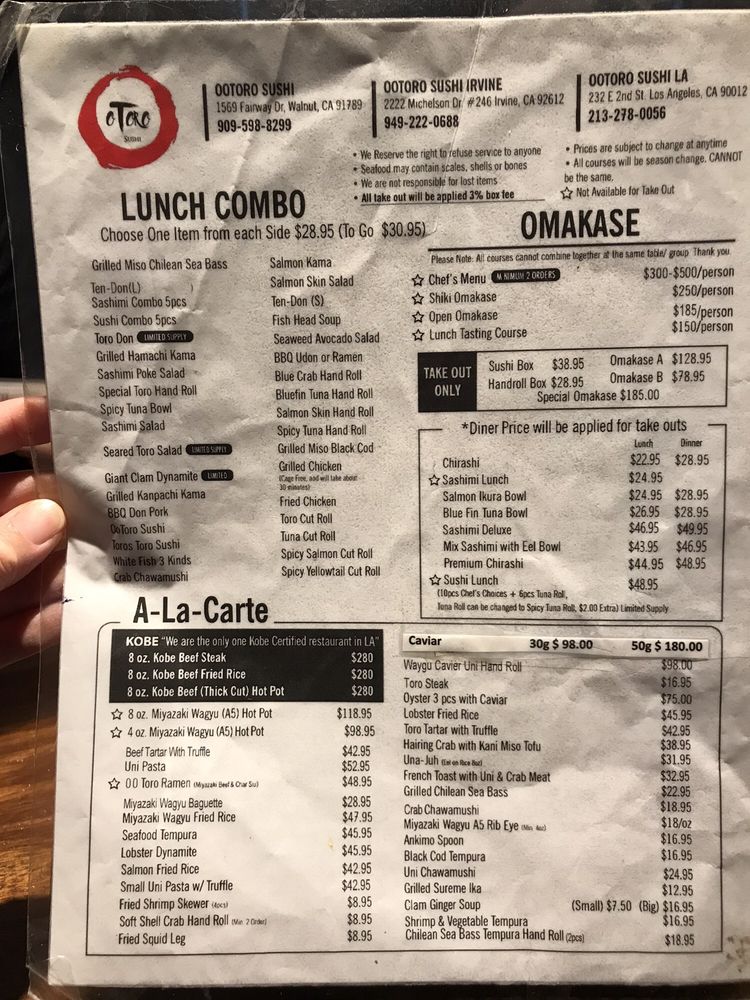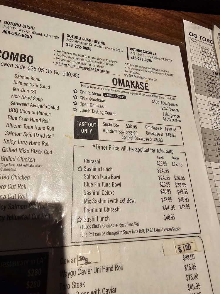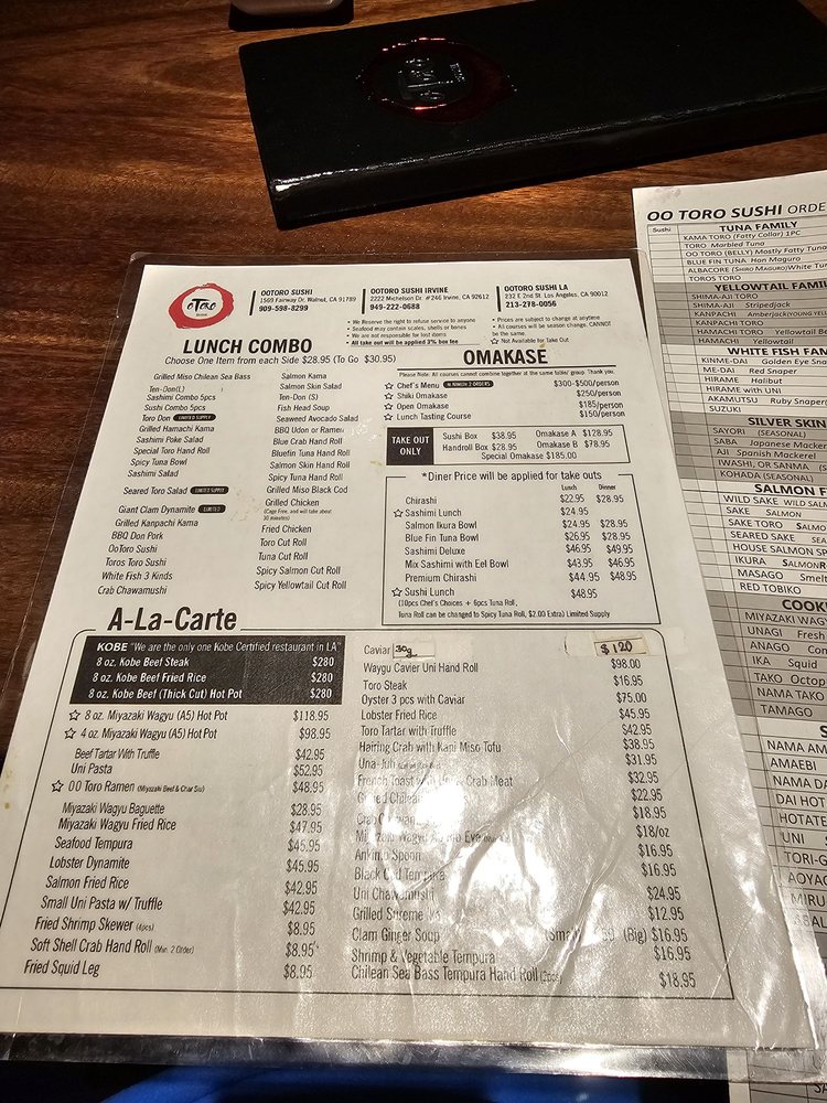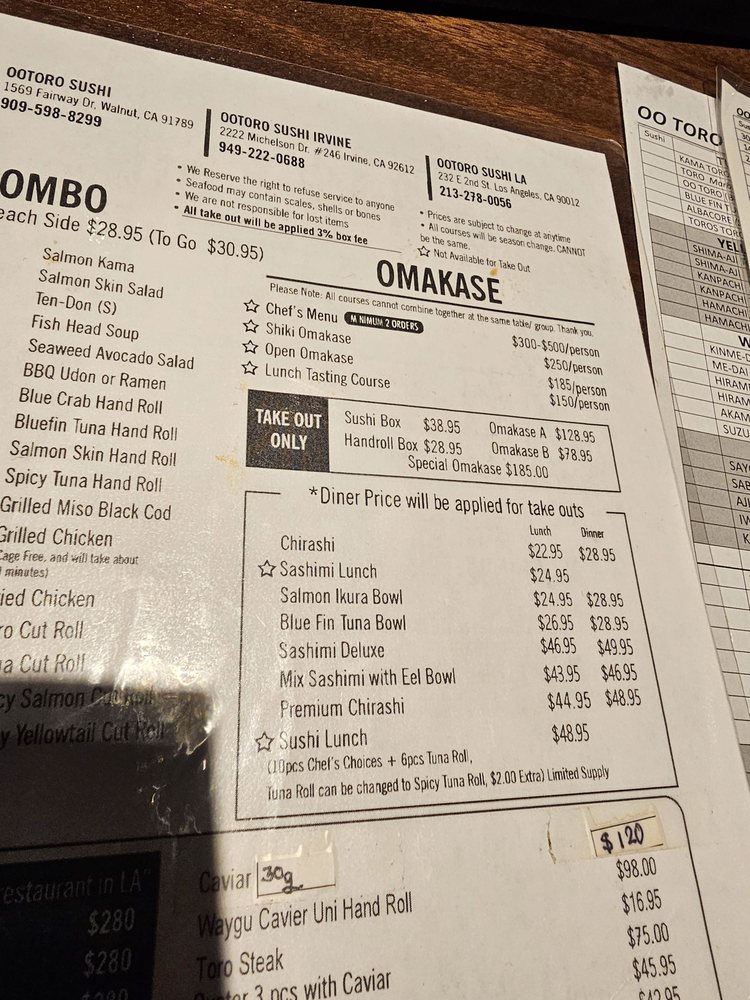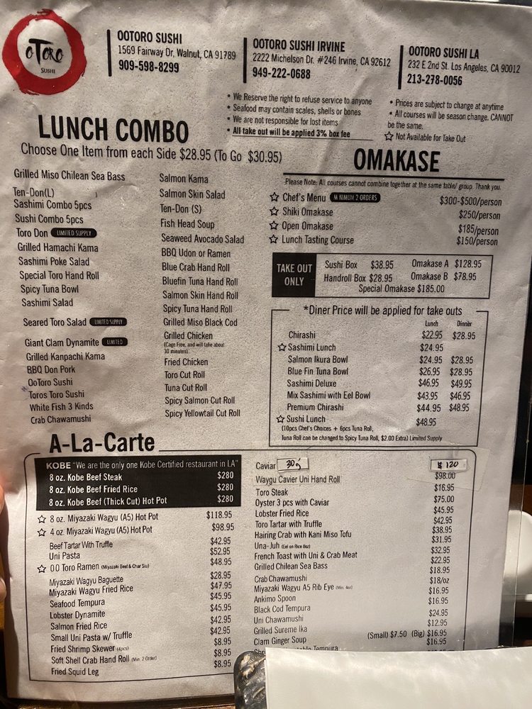 Located in Irvine, CA, Otoro Sushi offers a variety of dining options such as takeout, delivery, and reservations making it convenient for all types of patrons. With a casual yet upscale atmosphere, this restaurant caters to groups, kids, and is perfect for lunch or dinner outings. The menu includes vegan options, limited vegetarian choices, and a diverse selection of dishes focusing on fresh fish. Customers rave about the quality of the food, particularly the omakase lunch, chirashi bowl, and sashimi offerings. While there may be a wait during peak hours, the attentive service and overall dining experience make it worth the visit. Don't miss out on trying their delicious sushi boxes and unique dishes like the Uni pasta. Otoro Sushi is a must-visit for sushi enthusiasts looking for a top-notch dining experience.